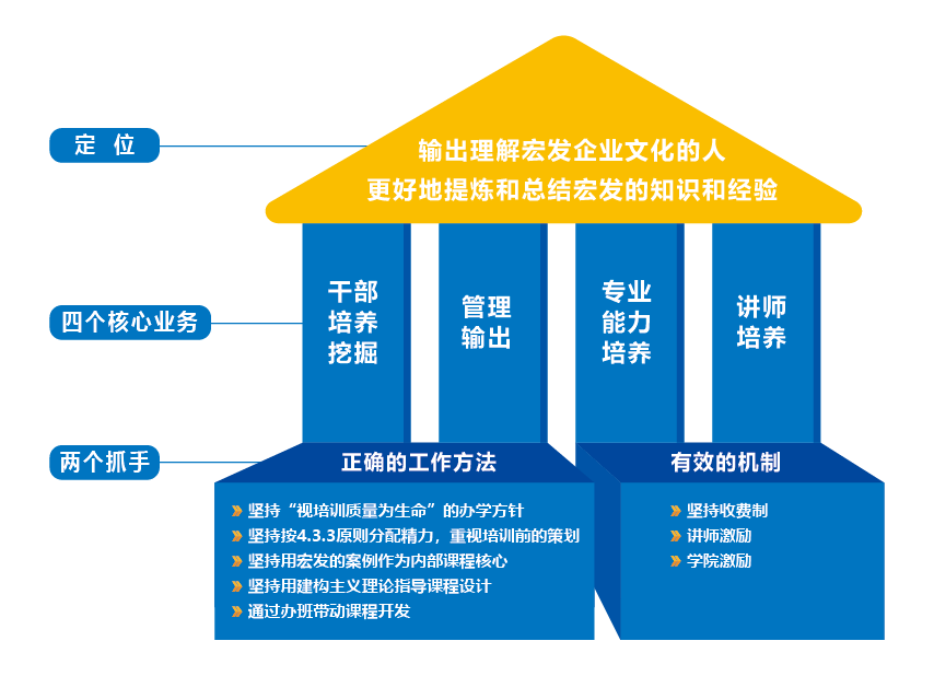 2019年正式更名后,面对更高的使命和要求,学院确立了“输出理解广东会企业文化的人”和“更好地提炼和总结广东会的知识和经验”的新定位,以“干部培养挖掘”、“管理输出”、“专业能力培养”、“讲师培养” 四个方面为核心业务,以“正确的工作方法”和“有效的机制”为两个抓手,致力打造富有特色的员工教育培训平台,为广东会发展提供重要的人才支撑。